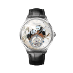 这款自动陀飞轮腕表采用弯曲锅盖形蓝宝石玻璃工艺、珍珠贝母面盘,三维立体打印。表款以国宝大熊猫为主题元素,熊猫有着和平、团结的美好寓意;熊猫也象征着人与自然的和谐相存;表盘描绘出两只熊猫、假山及竹子的画面,熊猫代表吉祥,竹子代表节节高 ,寓意吃竹常乐( 知足常乐)。 表壳造型圆润光泽,与表壳相连接的表耳结构分明,表耳贴合手腕曲线,佩戴舒适。表盘画面呈现生动美观。通过表盘6时位透视可以看到腕表搭载的自制精雕的自动上链陀飞轮机芯,能够提供50小时动力储备。这只3D打印大熊猫腕表呈现了知足常乐的图案,同时也展现了精湛的制表技艺,让我们领悟到了表款融于艺术的绝妙魅力。